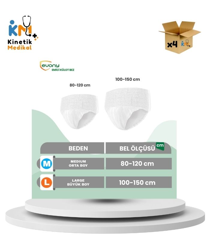 Evony külot hasta bezi Medium beden, yetişkin kullanıcılar için külot formunda tasarlanmıştır. 4 paket halinde toplam 120 adet ürün içerir ve pratik kullanım sunar.