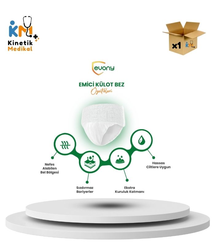 Evony külot hasta bezi, yetişkin bireylerin günlük kullanım ihtiyaçları göz önünde bulundurularak tasarlanmıştır. Külot formu sayesinde giyip çıkarılması kolaydır ve kullanım sırasında hareket özgürlüğünü destekleyen bir yapı sunar.
