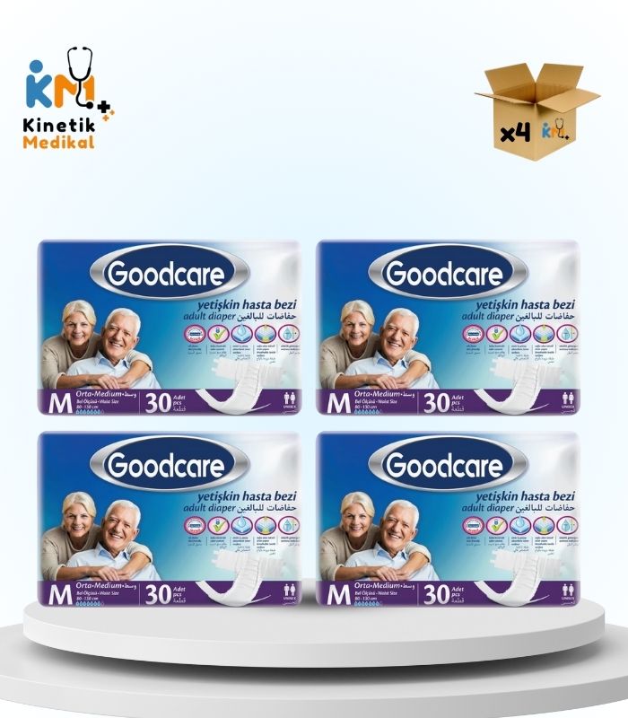 Goodcare M beden 4’lü paket, toplam 120 adet yüksek emici yetişkin hasta bezinden oluşur. Uzun süreli ve ekonomik kullanım için idealdir.